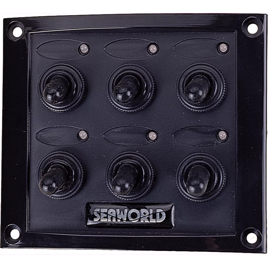 Sprutsikkert bryterpanel med seks vanntette brytere. Sikringer på baksiden av panelet. 12V.
