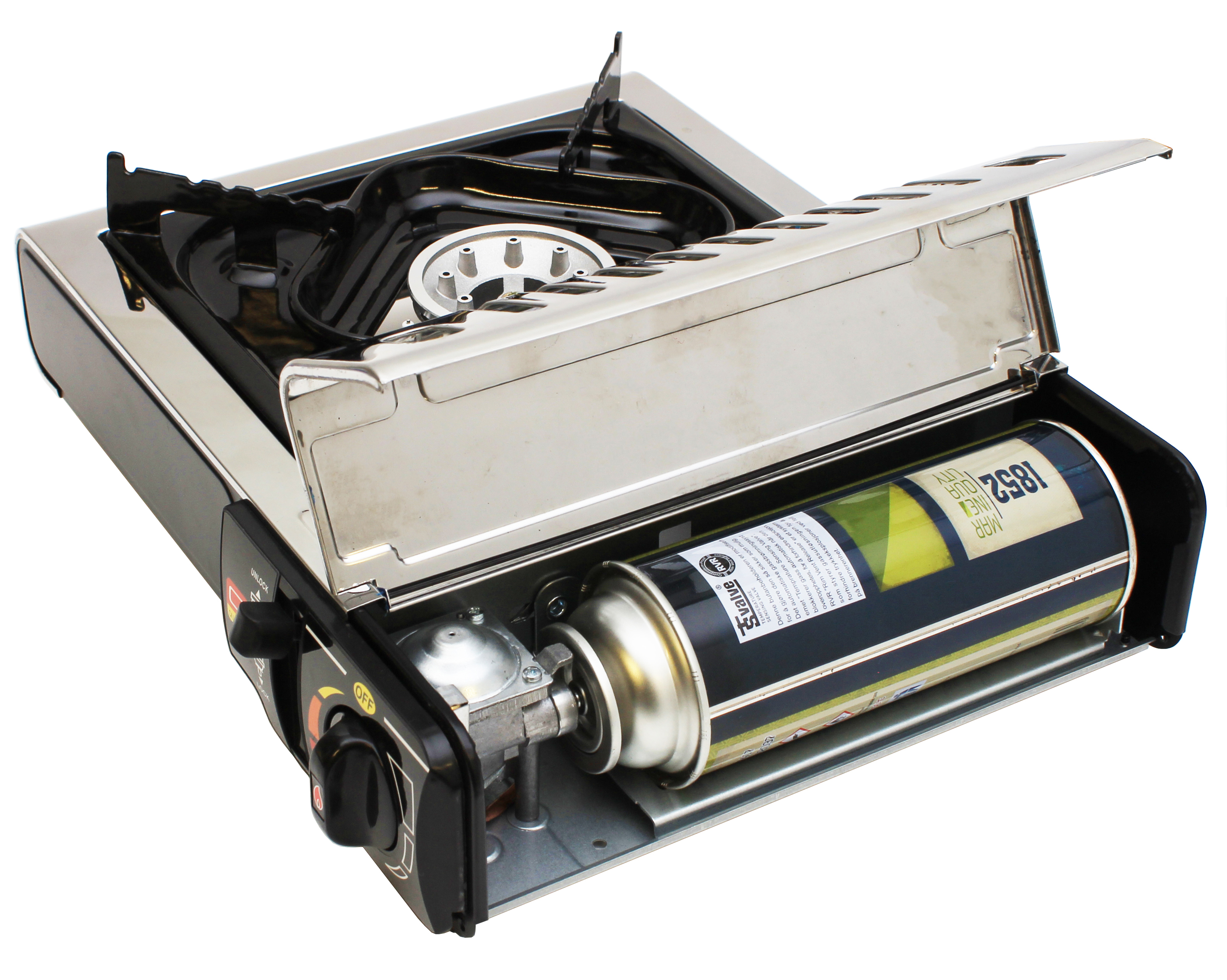 Lite og kompakt kokeapparat med plass til én gryte eller stekepanne. Brenneren har en stor flammespreder, som fordeler varmen godt, og sørger for jevn steking. Den høye effekten på hele 2500 watt gjør at vannet koker svært raskt, og at du kan oppnå perfekt stekeskorpe på biffene. Trinnløs flammeregulering sørger riktig temperatur. Kjelestøttene har gode riller som holder grytene trygt i posisjon.
